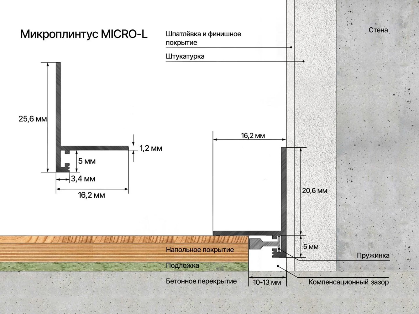 Версия микроплинтуса с заходом на стену. Для людей, которые беспокоятся об отделке стен во время уборки. Тонкая линия, образованная профилем обеспечивает помещению эстетичный внешний вид и создает пространство для акцентов.