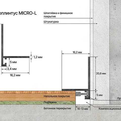 Версия микроплинтуса с заходом на стену. Для людей, которые беспокоятся об отделке стен во время уборки. Тонкая линия, образованная профилем обеспечивает помещению эстетичный внешний вид и создает пространство для акцентов.